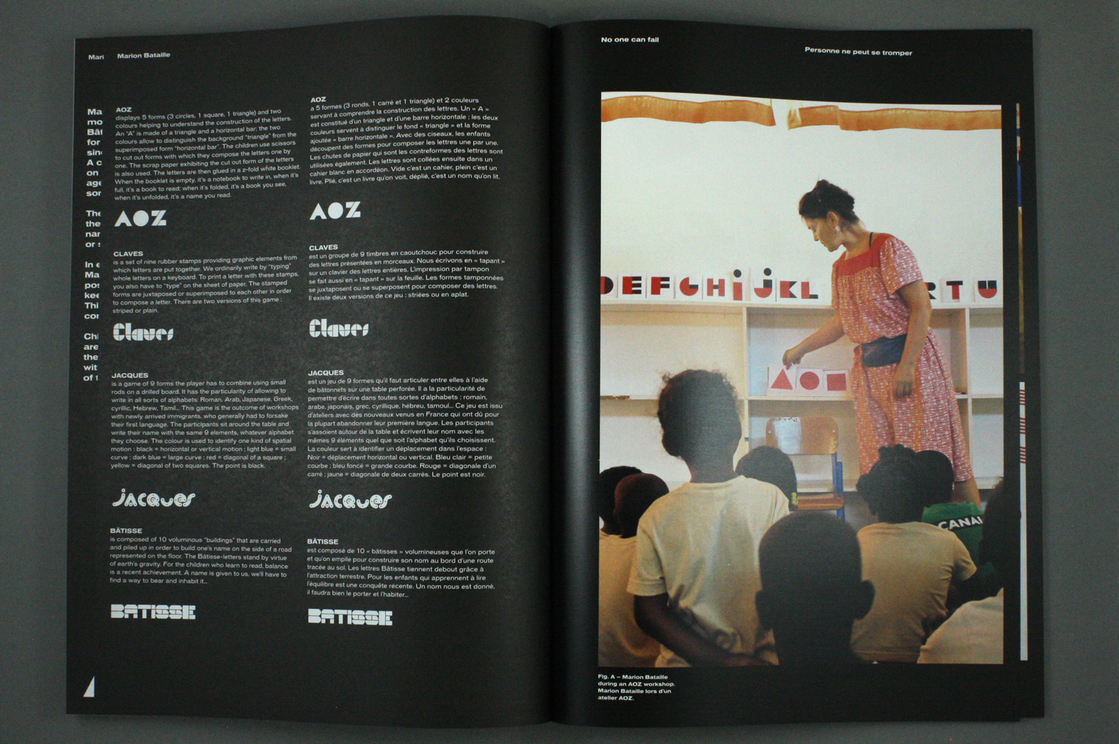 Spread zooming into the four different type design strategies (AOZ, Claves, Jacques and Bâtisse) on the left, and Marion Bataille during the AOZ workshop on the right.