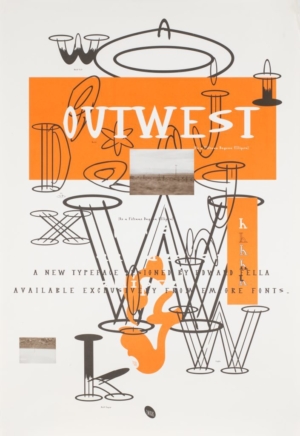 OutWest, Ed Fella, poster, 1993. Digitised by Zuzana Licko, the OutWest typeface was originally drawn by hand using a fifteen-degree ellipse architectural template.