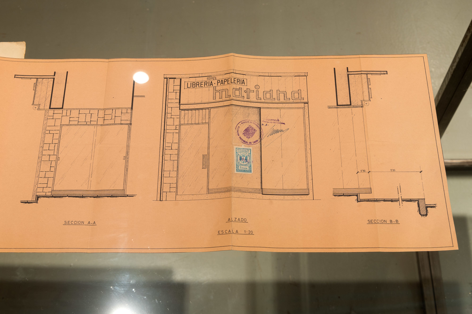 Original documents of the design of the sign for the bookshop Mariana, visible in the photo at the top.