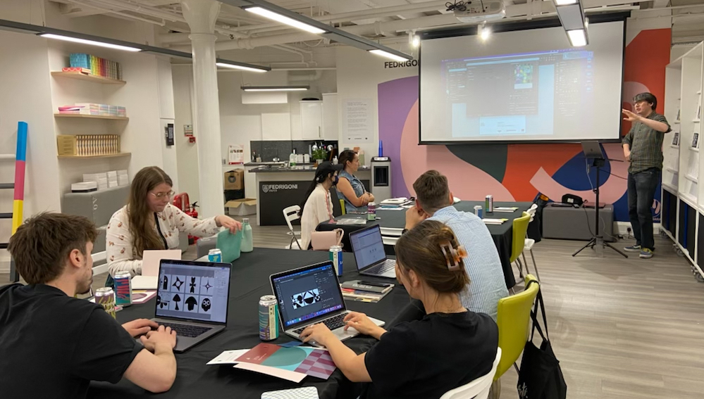 Oswin Tickler (far right) leading the ‘Fusing Frontiers: Coding The Printed Page’ workshop at the Fedrigoni studio in London.