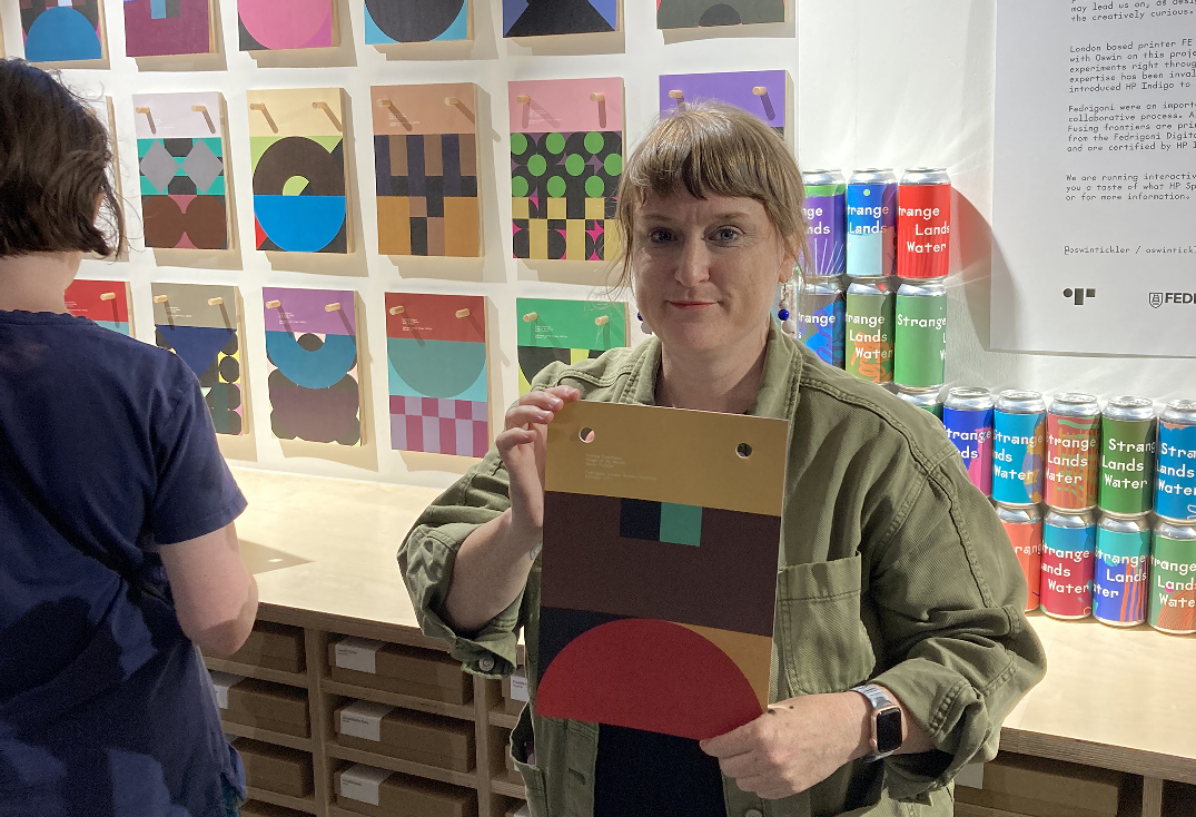 Workshop attendee Briar Levit (see Eye 95) with a single-edition algorithmic print of Flags of No Nation from Fusing Frontiers.