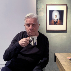 Right. Brian Griffin at the MMX Gallery in southeast London (with a Griffin portrait of Iggy Pop in the background), 2022. Snapshot by Magda Shackleton, Courtesy MMX Gallery.