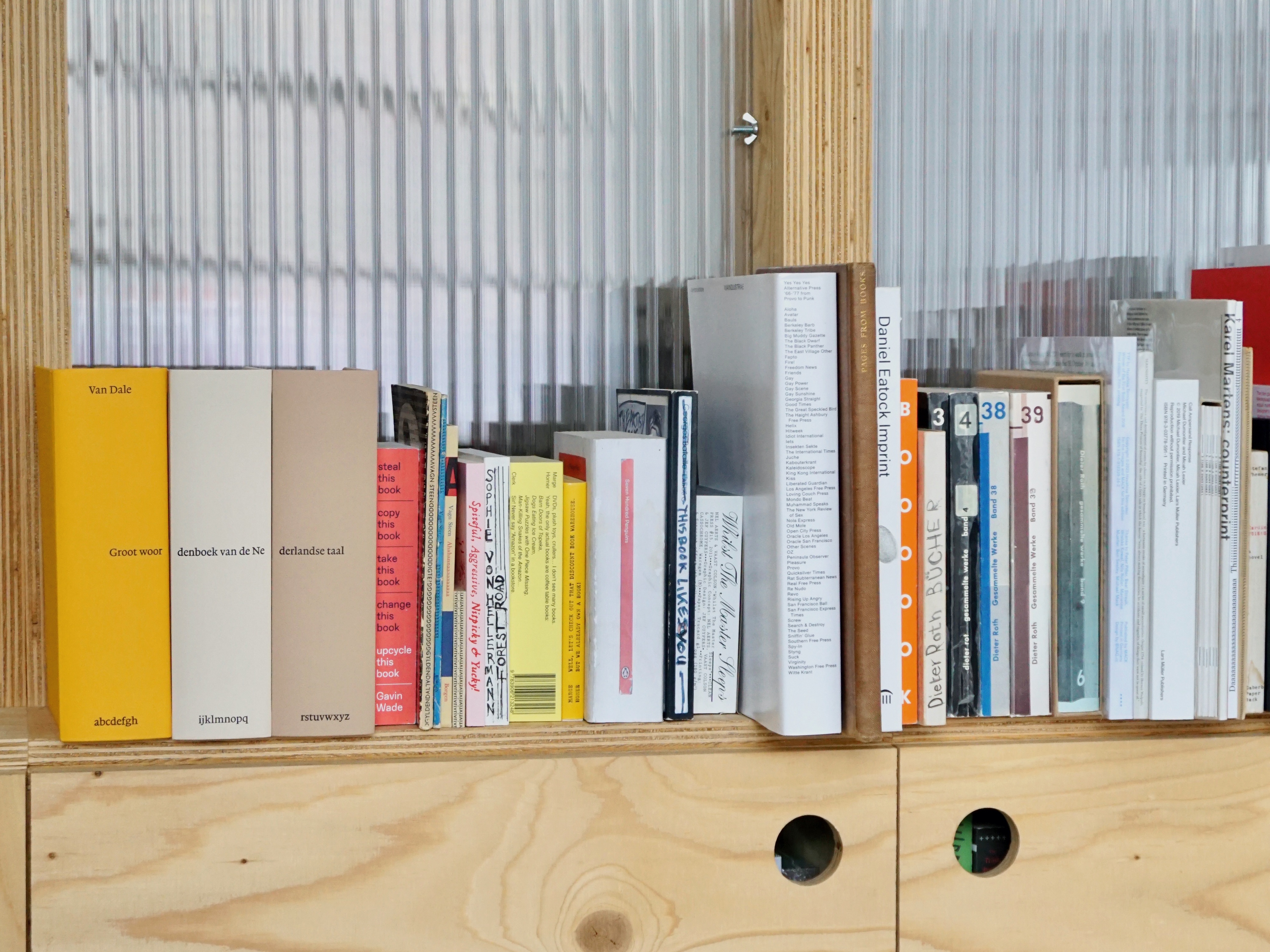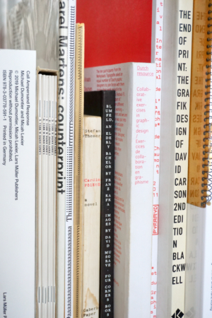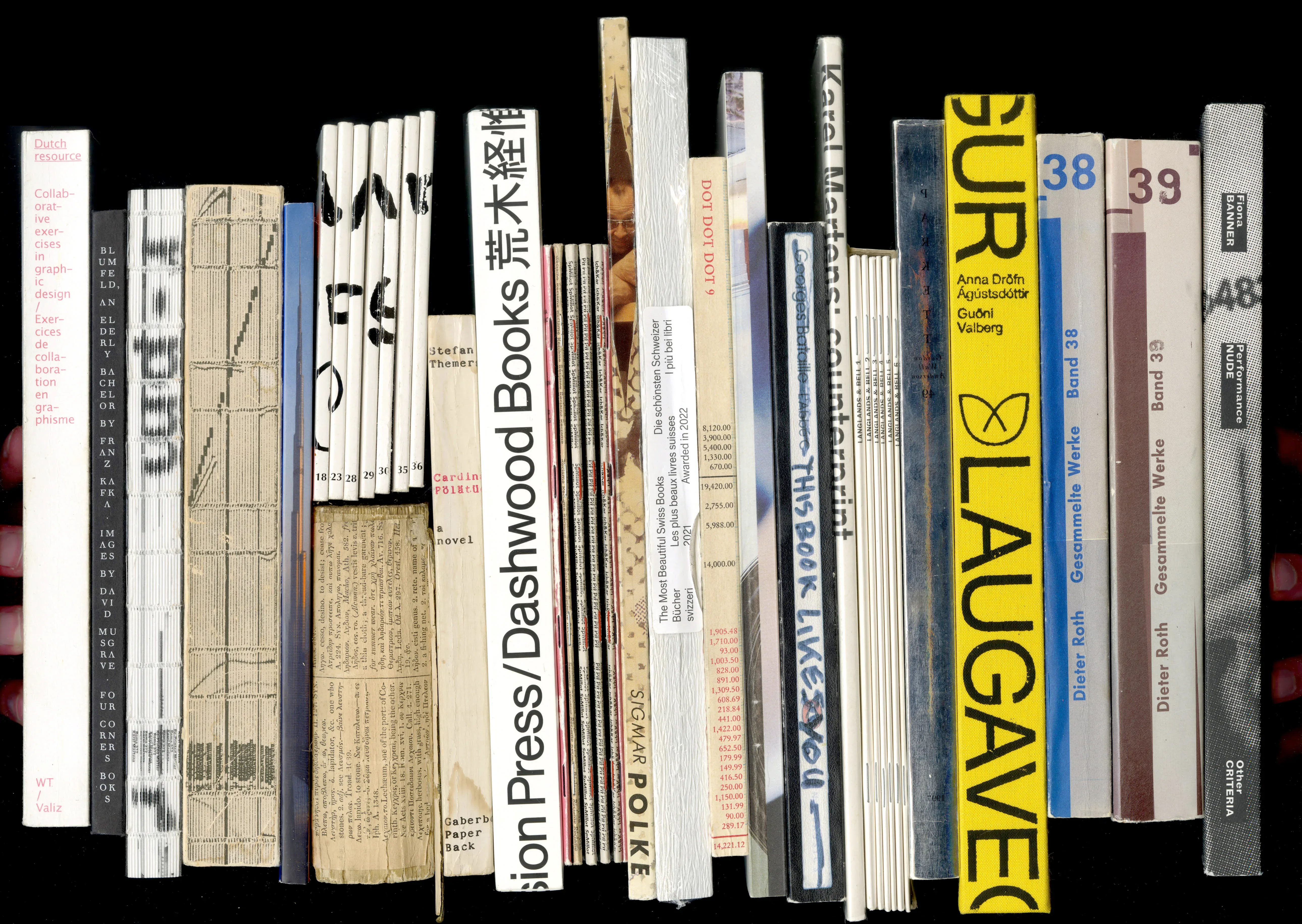 The display hints at international tensions when the spine text has to run vertically: English-language spines generally read top to bottom, European spines usually read bottom to top. There are big books where the spine is so wide that text can be arranged horizontally (step forward the three-volume Dikke Van Dale dictionary designed by Joost Grootens in 2022) and the thin volumes that won’t let a narrow spine restrict them.