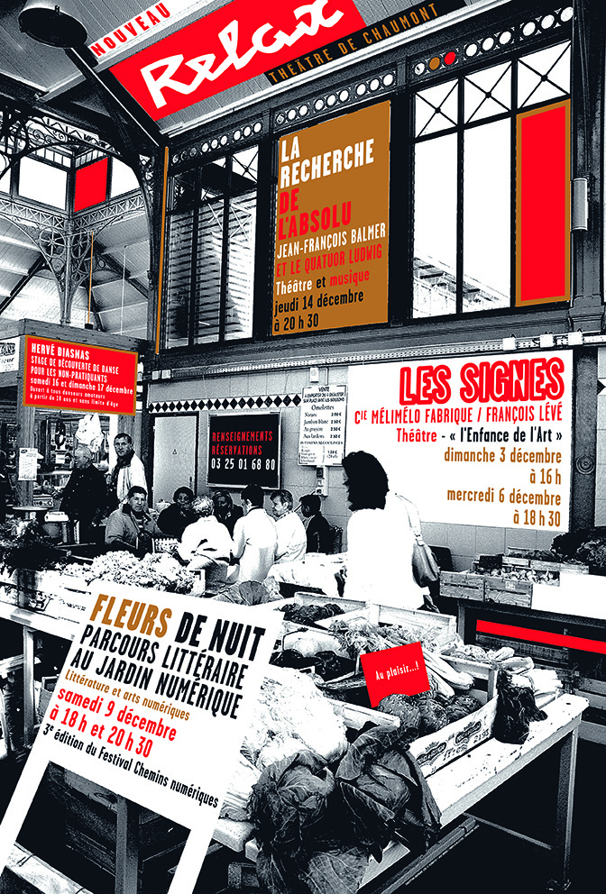 In 1999 Lenz was approached by Les Graphistes Associés, former Grapus members, who had worked for a city theatre south of Paris for four years. The place was Rungis – which is home to the world’s largest wholesale food market. Its conservative mayor had been annoyed and offended by Graphistes Associés’ subversive style and threatened to throw out theatre director Joël Gunzburger if he did not hire somebody else. The group’s coordinator Vincent Perrottet insisted that the theatre management should not hire an advertising agency, and work instead with Lenz.