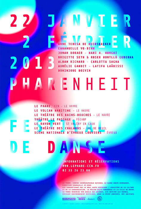Le Phare’s printed matter changes each season. The basis for pages and posters are processed photographs of moving people, sometimes monochrome, recently as multicoloured outlines that simulate ‘aura photography’. Always intriguing, Lenz’s dramatic restyling of dance photos represents exactly the kind of communication a contemporary dance centre requires.