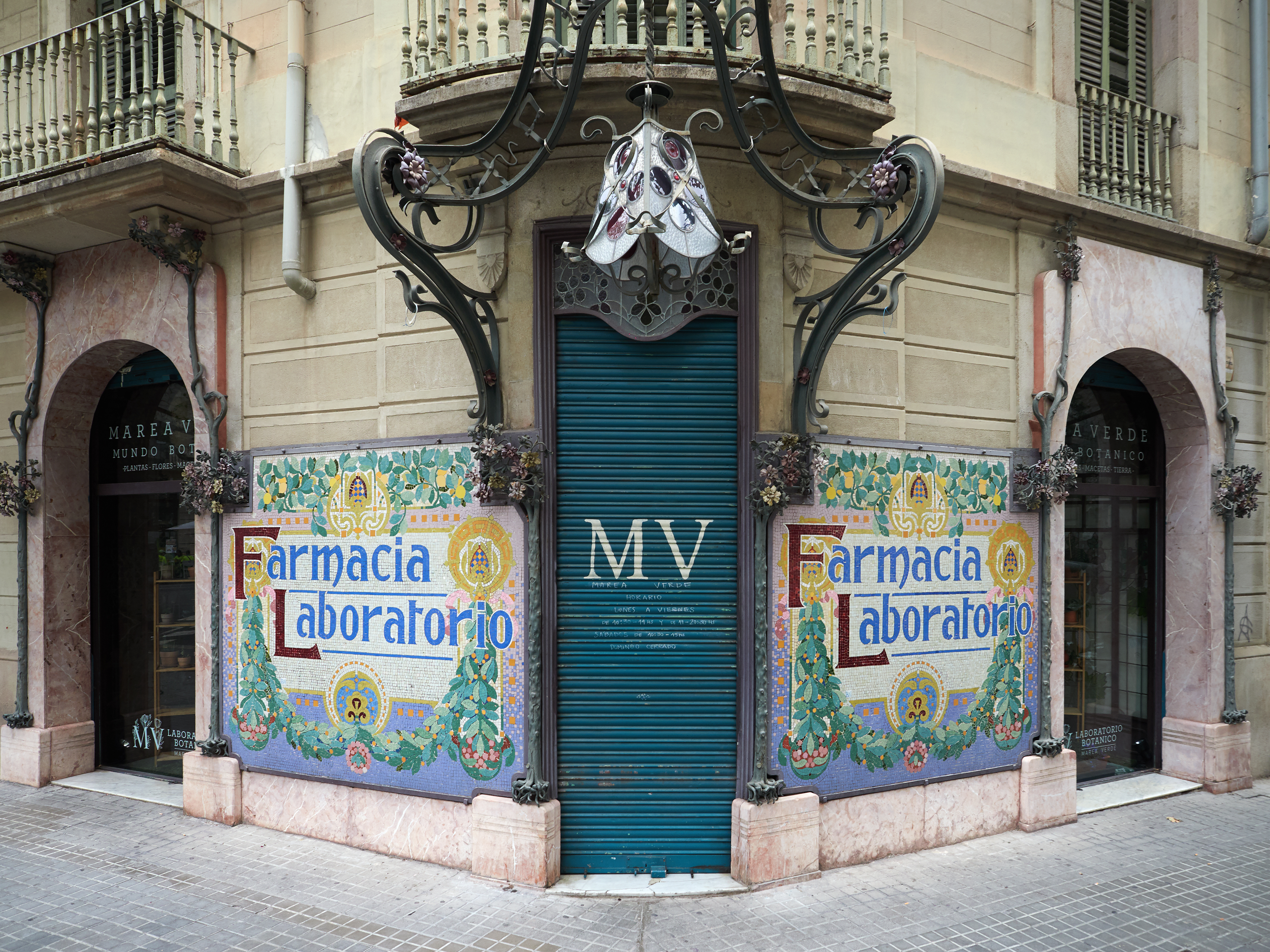 Mosaic lettering for Farmacia Laboratorio, 1925, by Lluís Brú i Salelles (who also did ‘Luz’, above). The pharmacy closed in 1987 and is now a plant shop.