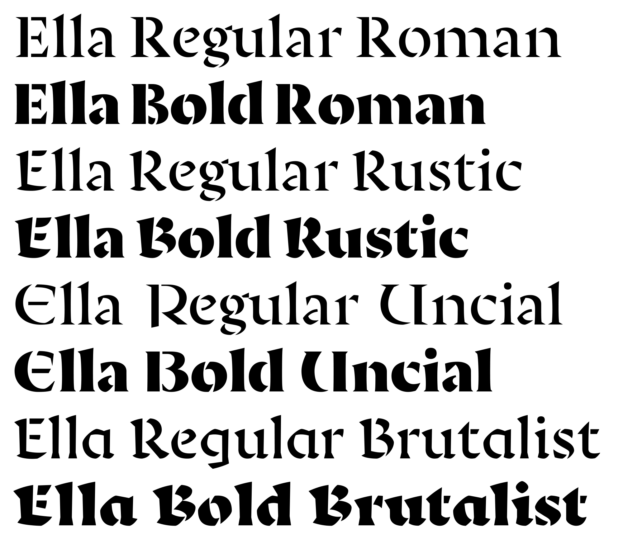 Meseguer’s most recent typeface, Ella, will enter the market in 2022. A font suite in four type families, Ella refers to very different elements. Her recent work is mostly based on hand-lettering and type, and questions how they are modified into a digital project. Another reference is the history of stencil letterforms, used in hand-lettering from Medieval church books to metal signs. Style wise, the four Ella families absorb and summarise styles from the traditional period between hand-written book copies and the Western invention of type.