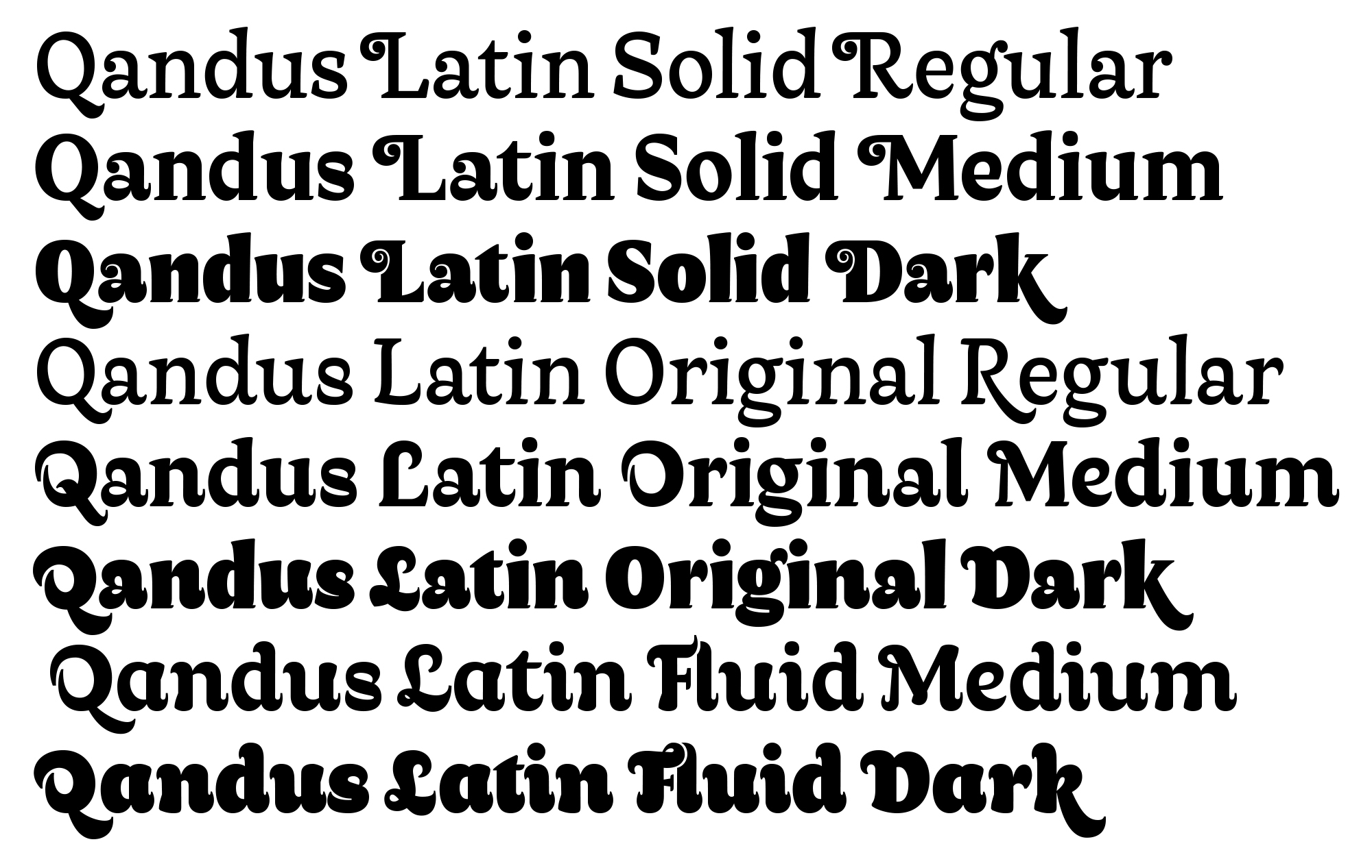 The collaborative Qandus pluri or multiscript family (2015-17) was part of a complex project called ‘Typographic Matchmaking in the Maghrib’, in which various groups of type designers met in Marrakesh, in North Africa, in 2015. Developed within the framework of the Khatt Foundation’s type design research project curated by Huda Smitshuijzen AbiFarès, its purpose was to create a modern typographic interpretation of the Maghribi style of the renowned, nineteenth-century Moroccan Sufi calligrapher Al-Qasim al-Qandusi.