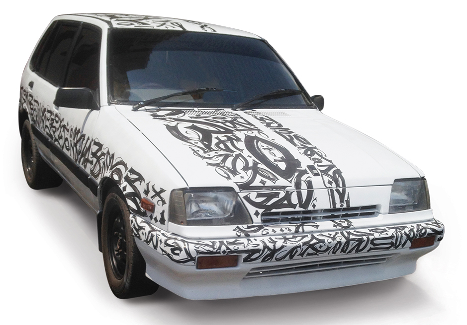 The session began with the Indonesian calligrapher Ferry Fatoni, whose presentation managed to rise above the online complexities of translation (from Indonesian) to display a range of dense, beautiful, and primarily radial, compositions using Javanese Script. The most memorable of these was Fatoni’s application of painted script across a less traditional context – namely the panels of his own car, which he named Helena.