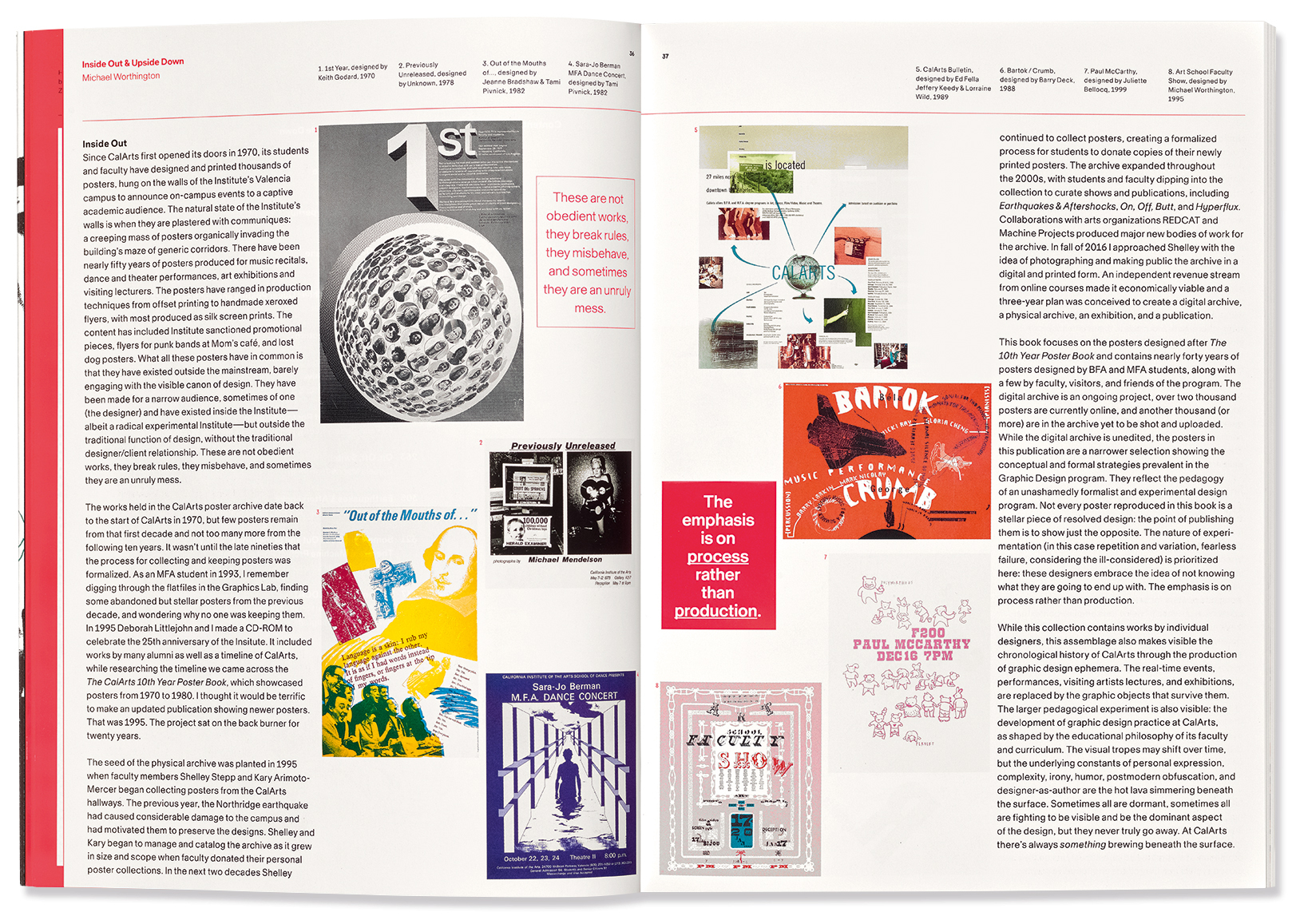 Last year, Worthington edited Inside Out & Upside Down: Posters from CalArts 1980-2019, the most complete overview of these posters to date. The book was intended to accompany an exhibition at the Redcat arts centre in Los Angeles, but the pandemic delayed the opening and the book – an edition of 700 copies with 70 different cover designs – appeared anyway. CalArts could not take it on, and it was not economically viable for a commercial publisher, so Worthington published it independently through his imprint MW Books.