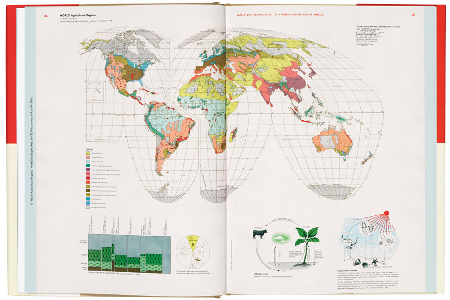 Far more people have heard of Herbert Bayer’s World Geo-Graphic Atlas than have encountered the hefty 40 × 29cm, 350-plus page book itself. This is because it was privately published in 1953 by Container Corporation of America (CCA) to be given as a corporate gift to its customers and friends (see ‘Big business, big world’ in Eye 82). Anyone who has had the opportunity to flip through the double-page spreads cannot help but recognise a masterpiece of graphic design. The experience of absorbing the graphics and text Bayer assembled is a tour through the highlights of Modernist information design. The book presents astronomy, geology and meteorology (among other sciences), as well as global natural resources, transportation and economics (among other topics), before descending into the sequence of maps we usually associate with an atlas. Even in this conventional part, maps of each state and country are punctuated with individual collages of images and economic data. Bayer manages to integrate complex combinations of maps, illustrations and data visualisation into a page flow of balanced white space, colour contrasts and typographic clarity.