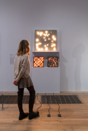 The exhibition strikes a balance between presenting a linear series of works and giving over entire spaces to immersive experiences. When I visited the room dedicated to Carlos Cruz-Diez’s Environnement Chromointerférent, it was packed with people of all ages interacting with dizzying vertical patterns projected over walls, balloons and boxes. There are other more meditative moments, however, including Otto Piene’s Light Room (Jena), Brion Gysin’s Dreamachine and Tatsuo Miyajima’s meditations on the ‘study of models of the world, of outer space, of time and of human society’. If ultra- high-contrast interference is more your thing, François Morellet’s Random distribution of 222,048 squares using the π number decimals, 50% odd digit blue, 50% even digit red certainly does exactly what it says on the tin, but don’t miss fellow GRAV artist Julio Le Parc’s Four Double Mirrors, a portent of social media image filters and an echo of fairground halls of mirrors.